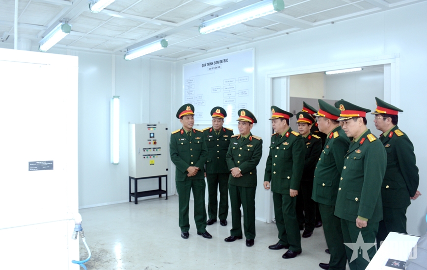 | Thiếu tướng Nguyễn Đình Chiêu cùng các đại biểu tham quan hệ thống kho, xưởng của Kho K680 trước buổi sinh hoạt. |