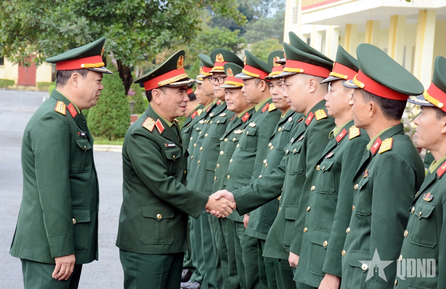 | Các đồng chí trong Đảng ủy, chỉ huy Kho K680 đón Thiếu tướng Nguyễn Đình Chiêu đến chủ trì buổi sinh hoạt. |