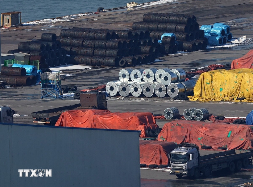 | Thép thành phẩm chờ xuất khẩu tại khu cảng ở Pyeongtaek, Hàn Quốc. (Ảnh minh họa: Yonhap/TTXVN) |