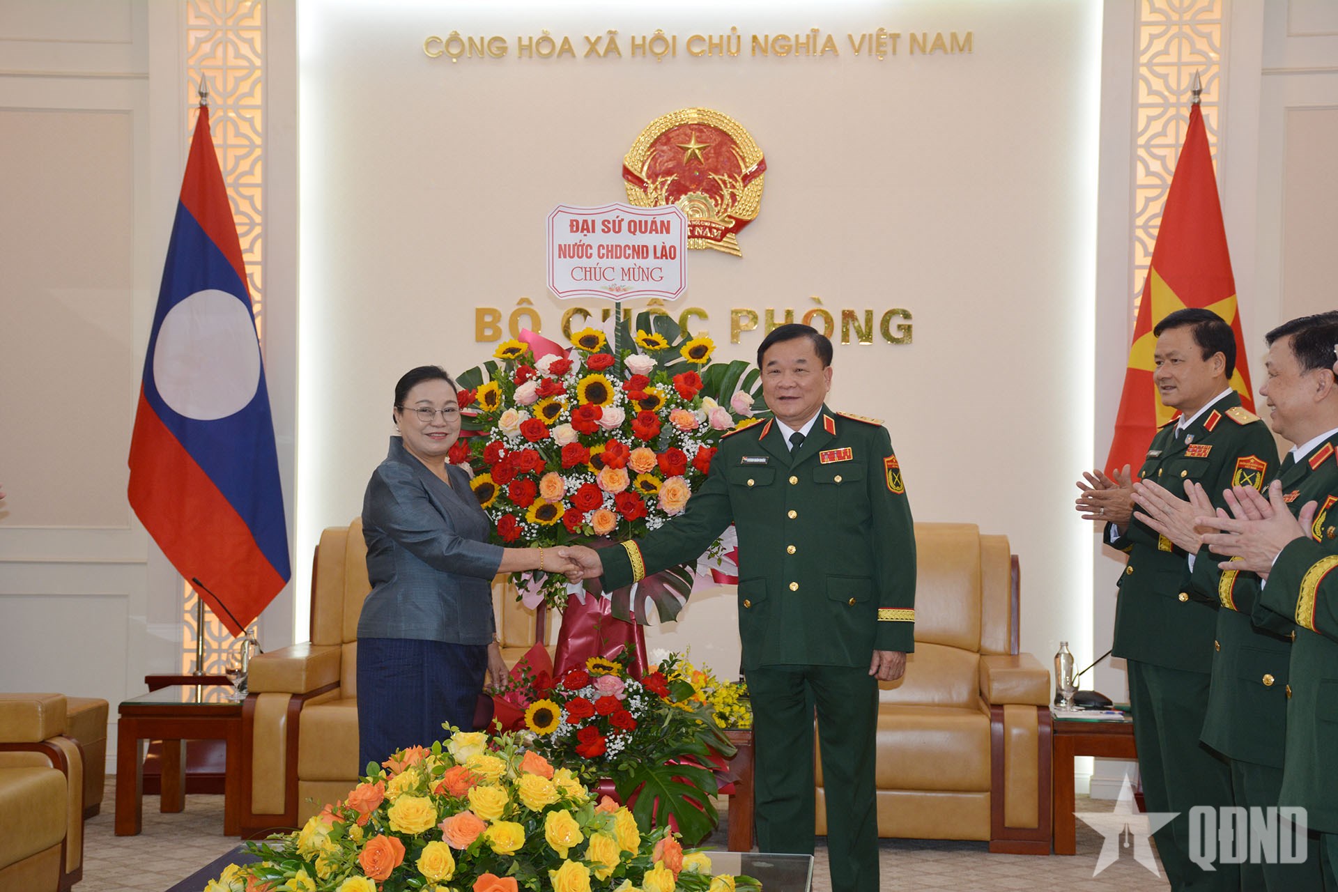 | Đại sứ Khamphao Ernthavanh trao lẵng hoa chúc mừng của Đại sứ quán Lào tại Việt Nam. |