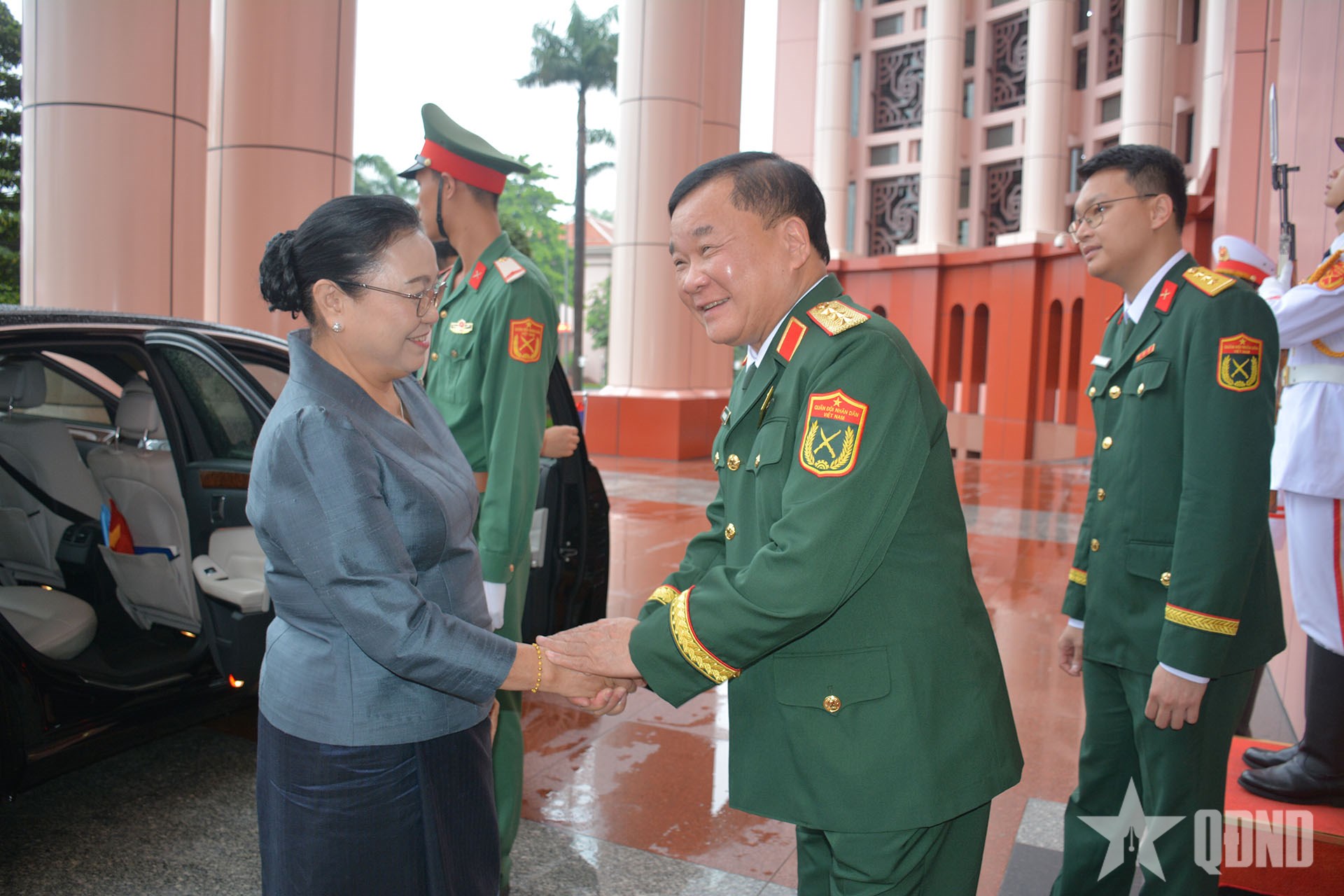 Thượng tướng Hoàng Xuân Chiến đón Đại sứ Lào tại Việt Nam Khamphao Ernthavanh. |