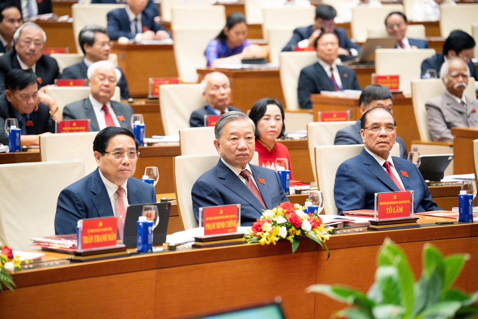 Tổng Bí thư Tô Lâm, nguyên Tổng Bí thư Nông Đức Mạnh, Thủ tướng Phạm Minh Chính và các đại biểu tham dự Đại hội đại biểu Đảng bộ Quốc hội. Ảnh: P.Thắng