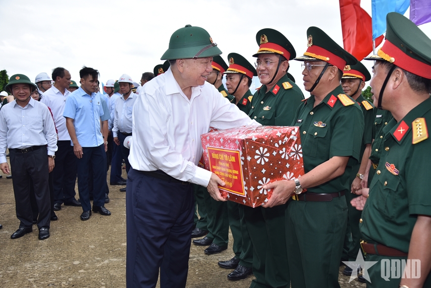 | Tổng Bí thư Tô Lâm cùng đoàn công tác tặng quà các đơn vị đang thi công 2 công trình trọng điểm trên địa bàn Hòn Khoai, xã Đất Mũi, tỉnh Cà Mau. |