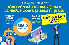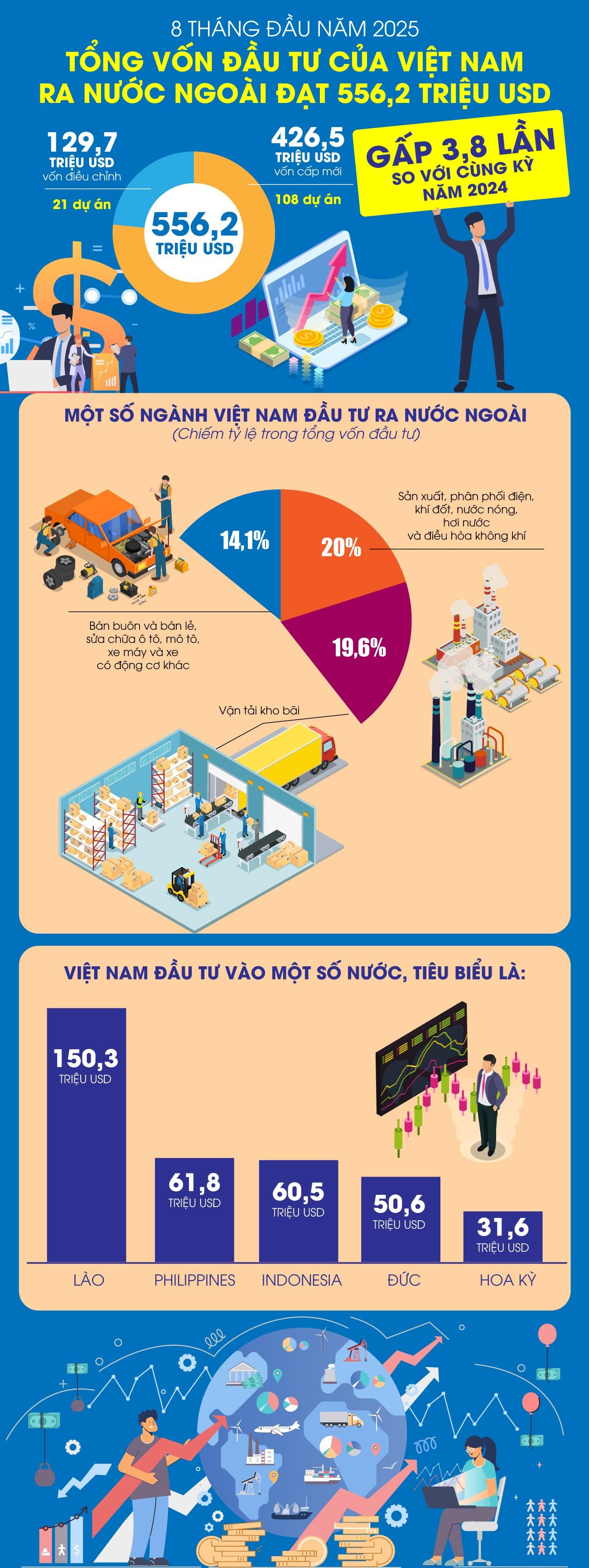 Cụ thể, trong 8 tháng năm 2025, có 108 dự án được cấp mới giấy chứng nhận đầu tư với tổng số vốn của phía Việt Nam là 426,5 triệu USD, gấp 2,9 lần so với cùng kỳ năm 2024; có 21 lượt dự án điều chỉnh vốn với số vốn điều chỉnh tăng 129,7 triệu USD.