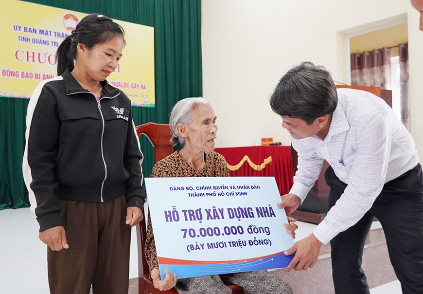 | Lãnh đạo Ủy ban Mặt trận Tổ quốc Việt Nam TP Hồ Chí Minh trao kinh phí hỗ trợ người dân tỉnh Quảng Trị. Ảnh: THÁI PHÚ |