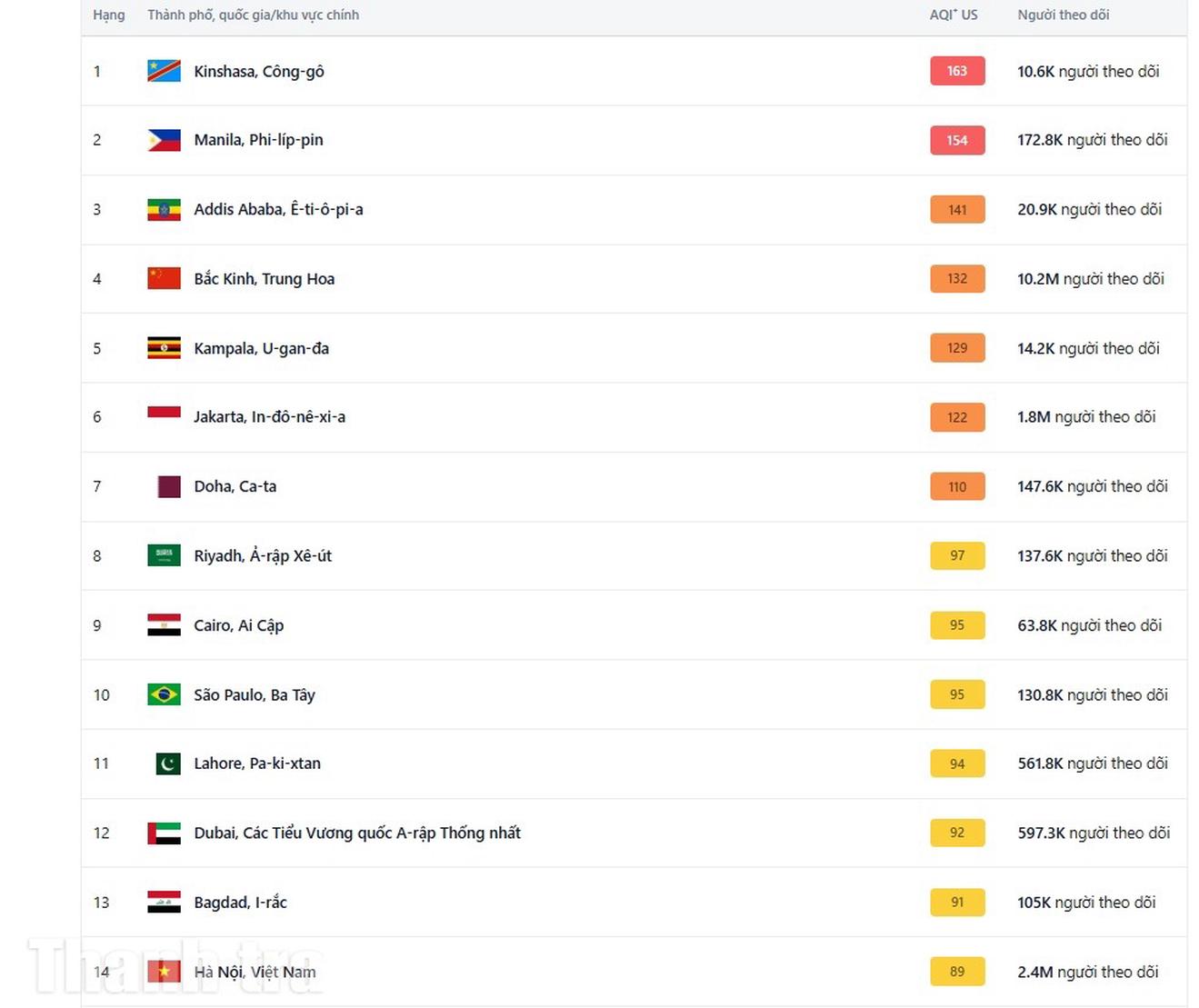 Theo hệ thống quan trắc không khí IQAir, vào lúc 7h30 sáng 10/9, Hà Nội đứng thứ 8 trong danh sách 126 thành phố ô nhiễm trên thế giới. Đến 6h37 sáng nay (11/9), Hà Nội vẫn xếp thứ 14 trong danh sách.
