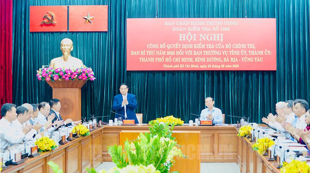 Chiều 23/2, tại Thành phố Hồ Chí Minh, Ủy viên Bộ Chính trị, Thủ tướng Chính phủ Phạm Minh Chính, Trưởng đoàn Kiểm tra số 1908 của Bộ Chính trị, Ban Bí thư đã chủ trì hội nghị công bố quyết định kiểm tra đối với các Ban Thường vụ Thành ủy, Tỉnh ủy 3 địa phương: Thành phố Hồ Chí Minh, Bình Dương, Bà Rịa-Vũng Tàu.