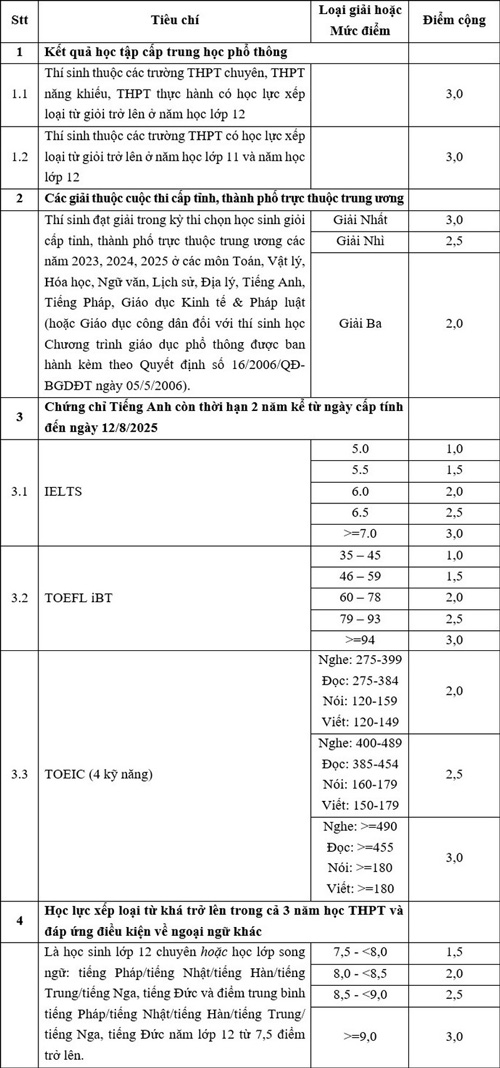 - Xét tuyển dựa vào kết quả kỳ thi tốt nghiệp THPT năm 2025. Với phương thức này, thí sinh có thể áp dụng đồng thời nhiều mức điểm cộng tương ứng với các thành tích đạt được. Tuy nhiên, điểm cộng không vượt 10% mức điểm tối đa của thang điểm xét tuyển (3 điểm/thang 30 điểm). Dưới đây là thông tin chi tiết: