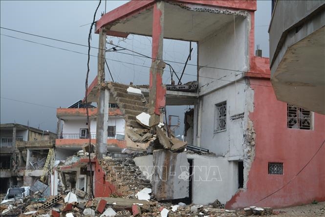 | Những tòa nhà bị phá hủy trong các vụ không kích của Israel xuống thị trấn Mashgharah, miền Đông Lebanon, ngày 21-3-2026. |