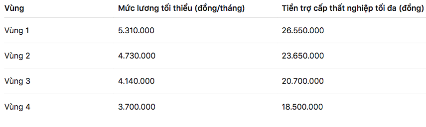 Trợ cấp thất nghiệp tối đa = 5 x mức lương tối thiểu vùng.