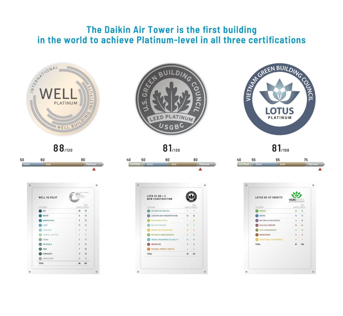 Cụ thể, Daikin Air Tower đạt được LEED Platinum từ Hội đồng Công trình Xanh Hoa Kỳ (USGBC) chứng minh công trình được thiết kế, thi công và vận hành theo các tiêu chí tối ưu hóa hiệu suất năng lượng, sử dụng tài nguyên hiệu quả và giảm thiểu tác động môi trường.