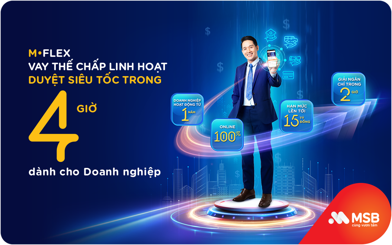 Doanh nghiệp có thể thực hiện vay thế chấp linh hoạt 100% online với hạn mức lên tới 15 tỷ đồng thông qua giải pháp M-Flex của MSB, thời gian phê duyệt chỉ trong vòng 4 giờ.