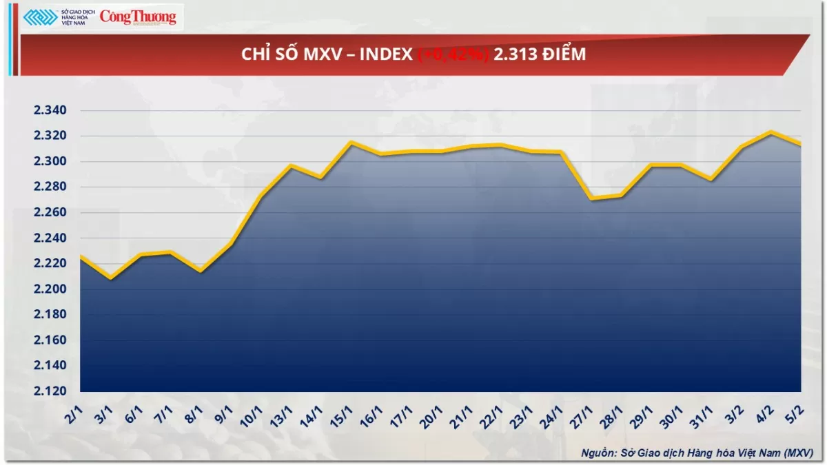Theo Sở Giao dịch Hàng hóa (MXV), thị trường hàng hóa nguyên liệu thế giới tiếp tục biến động mạnh trong phiên giao dịch ngày hôm qua (5/2). Thị trường cà phê tiếp tục gây sự chú ý đặc biệt của giới đầu tư khi chứng kiến chuỗi tăng giá dài nhất trong vòng khoảng 45 năm qua. Trong đó, giá cà phê tiếp đà bật tăng gần 4% lên 8.768 USD/tấn. Ở chiều ngược lại, giá hai mặt hàng dầu thô cùng nhau suy yếu trong bối cảnh tồn kho tại Mỹ tăng. Đóng cửa, lực bán chiếm ưu thế đã kéo chỉ số MXV-Index giảm 0,42% về mức 2.313 điểm.
