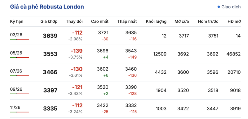 Cụ thể, kết thúc phiên giao dịch gần nhất, giá cà phê Robusta tại London ghi nhận phiên giảm giá sâu. Trong đó, kỳ giao tháng 1/2026 giảm đến 112 USD/tấn, xuống mức 3.639 USD/tấn. Hợp đồng giao kỳ hạn tháng 11/2026 cũng giảm mạnh 121 USD/tấn, xuống mức 3.397 USD/tấn.