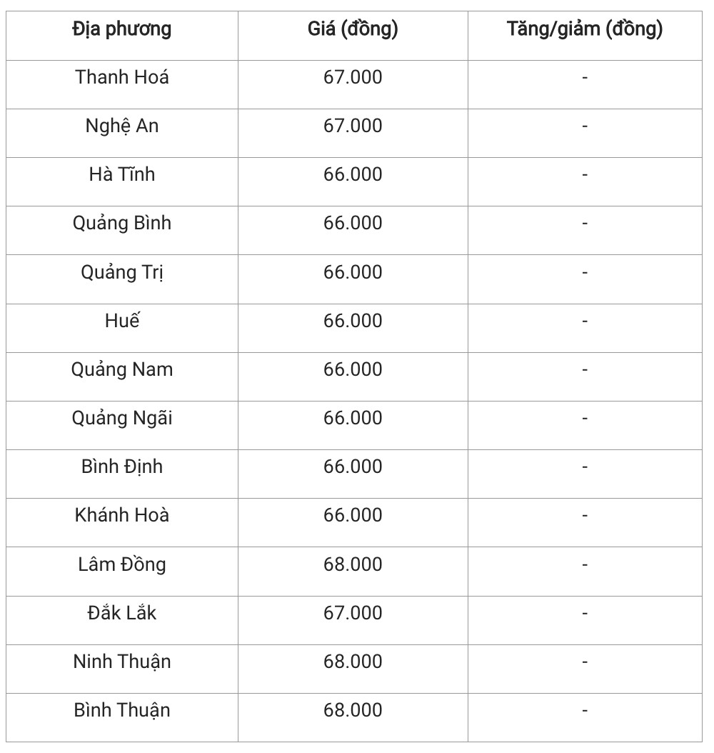 Trong đó, các tỉnh Lâm Đồng, Ninh Thuận và Bình Thuận là những địa phương có giá heo hơi cao nhất khu vực, đạt 68.000 đồng/kg. Ngược lại, mức giao dịch thấp nhất là 66.000 đồng/kg xuất hiện tại hai tỉnh Bình Định và Khánh Hoà.