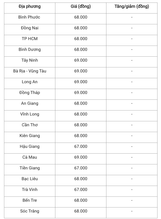 Đây là khu vực có giá heo hơi cao nhất cả nước khi các tỉnh Tây Ninh, Bà Rịa - Vũng Tàu, Long An, Đồng Tháp và Cà Mau vẫn duy trì mức giá 69.000 đồng/kg.