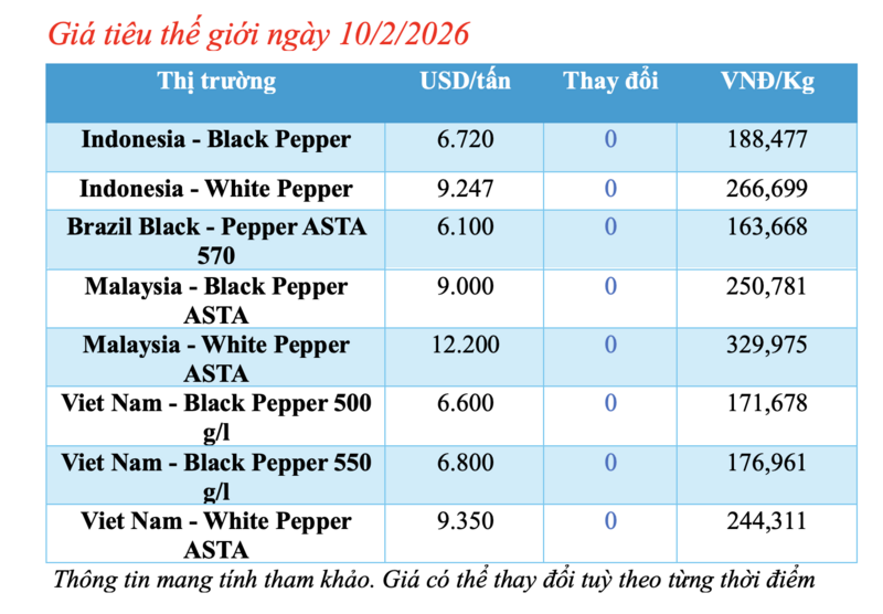 Tương tự, giá tiêu trắng Muntok của Indonesia cũng đi ngang so với ngày hôm qua, hiện đạt mức 9.247 USD/tấn.