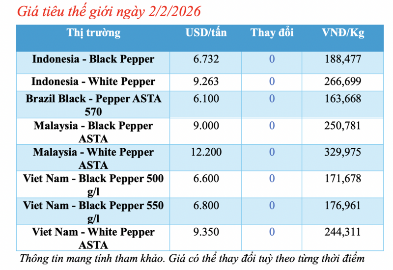 Tương tự, giá tiêu trắng Muntok của Indonesia cũng đi ngang so với ngày hôm qua, hiện đạt mức 9.263 USD/tấn.