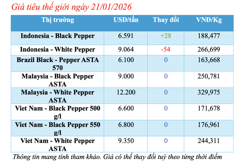 Cụ thể, giá tiêu đen Lampung của Indonesia được niêm yết ở mức 6.591 USD/tấn, tăng 28 USD/tấn so với ngày hôm trước.