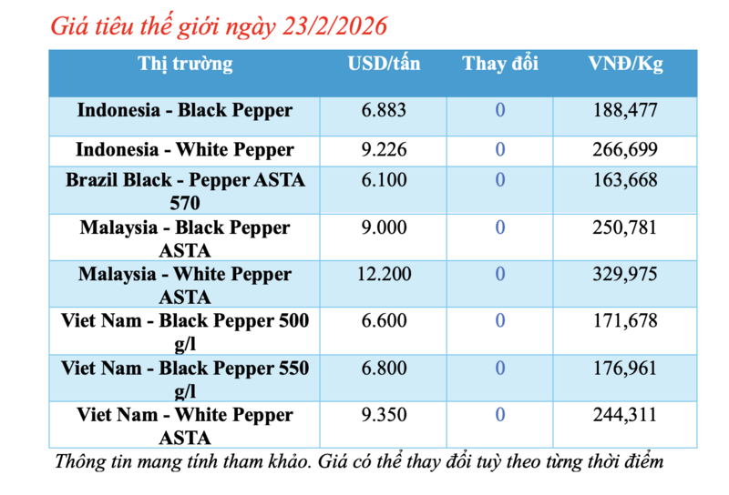 Tương tự, giá tiêu trắng Muntok của Indonesia cũng đi ngang so với ngày hôm qua, hiện đạt mức 9.226 USD/tấn.