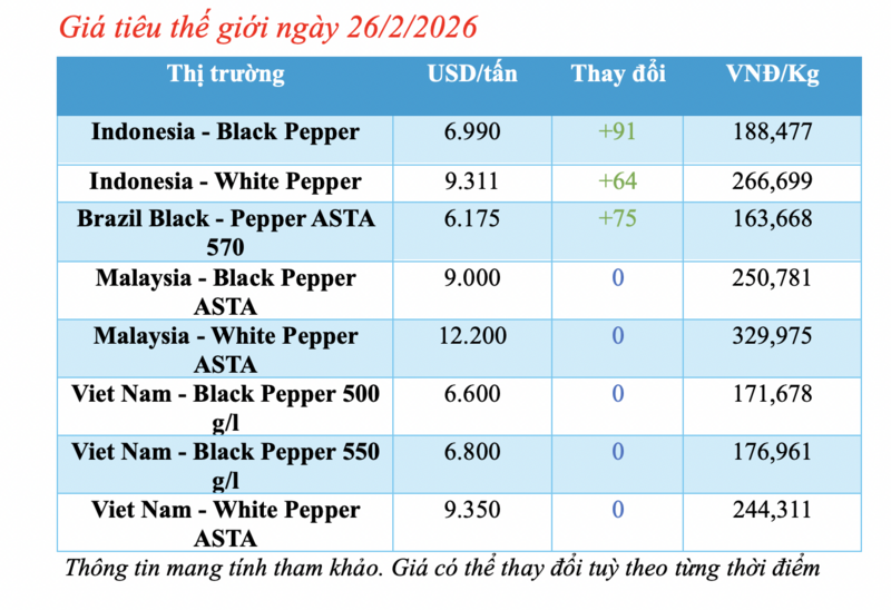 Tương tự, giá tiêu trắng Muntok của Indonesia cũng tăng 64 USD/tấn so với ngày hôm qua, hiện đạt mức 9.311 USD/tấn.