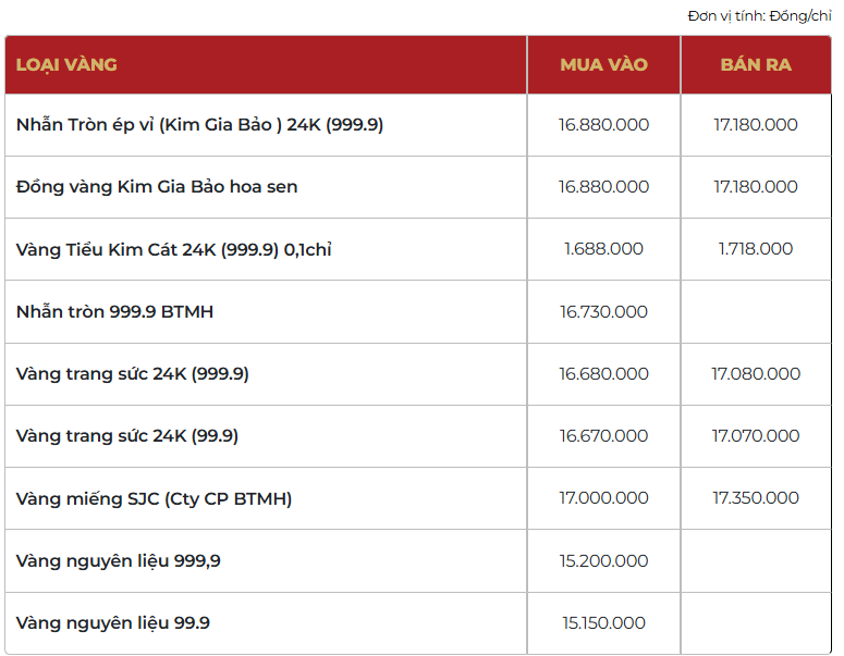 Bảo Tín Mạnh Hải niêm yết giá nhẫn tròn ép vỉ Kim Gia Bảo ở mức 168,8 - 171,8 triệu đồng/lượng (mua vào - bán ra), giảm 4,2 triệu đồng/lượng cả hai chiều mua vào và bán ra so với chốt phiên giao dịch trước.