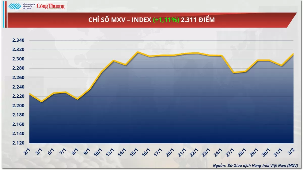 Theo Sở Giao dịch Hàng hóa Việt Nam (MXV), thị trường hàng hóa nguyên liệu thế giới biến động mạnh trong phiên giao dịch đầu tuần (3/2). Đáng chú ý là thị trường nông sản khi có đến 6 trên 7 mặt hàng đồng loạt tăng giá. Bên cạnh đó, bảng giá năng lượng, giá hai mặt hàng dầu thô tăng nhẹ, trong khi giá khí đốt tăng vọt hơn 10%. Đóng cửa, lực mua chiếm áp đảo kéo chỉ số MXV-Index tăng 1,11% lên mức 2.311 điểm.