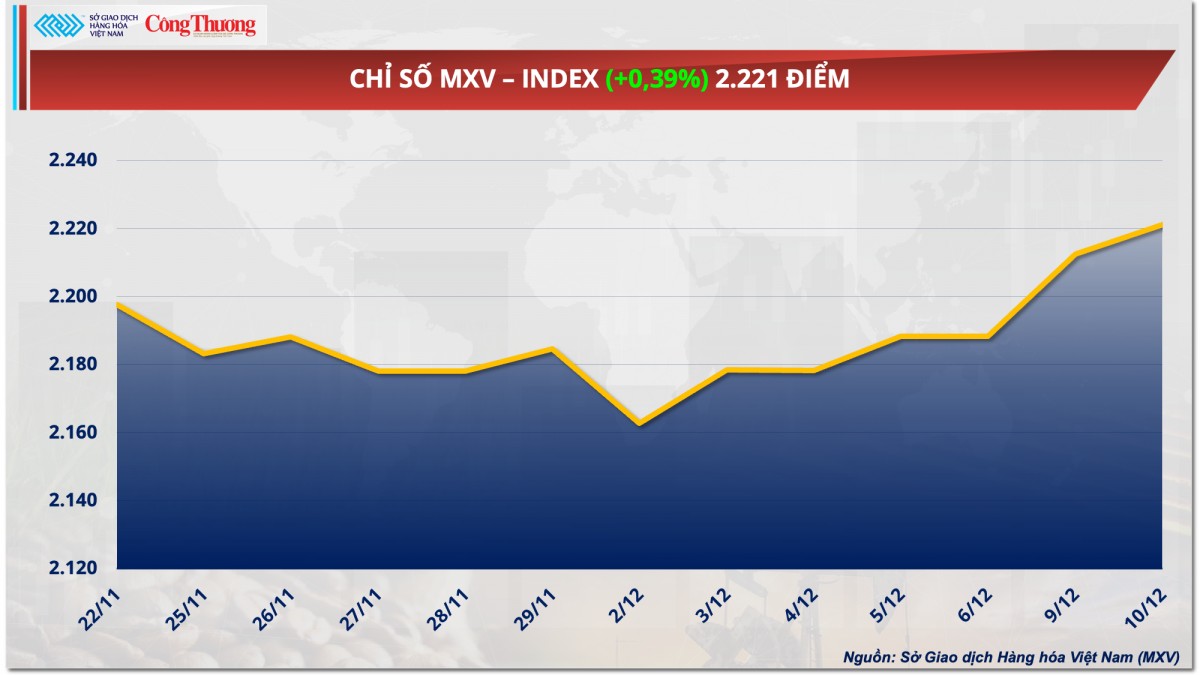 Theo Sở Giao dịch Hàng hóa Việt Nam (MXV), sắc xanh áp đảo trên bảng giá hàng hóa nguyên liệu thế giới trong phiên giao dịch ngày hôm qua (10/12). Đóng cửa, chỉ số MXV-Index tăng 0,39% lên 2.221 điểm. Đáng chú ý, trên thị trường nguyên liệu công nghiệp, giá mặt hàng cà phê Arabica tiếp tục chinh phục kỷ lục lịch sử khi tiến sát mốc 7.400 USD. Bên cạnh đó, thị trường nông sản cũng có 5 trên 7 mặt hàng đồng loạt tăng giá tích cực, trong đó ngô ghi nhận phiên tăng thứ tư liên tiếp.