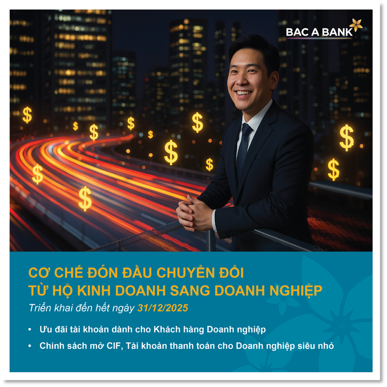 Có thể nói, việc chuyển đổi từ hộ kinh doanh sang doanh nghiệp không chỉ là yêu cầu cấp thiết, mà còn là cơ hội để nâng cao hiệu quả quản trị, mở rộng thị trường và tiếp cận các nguồn vốn ưu đãi. Với “Cơ chế đón đầu chuyển đổi từ Hộ kinh doanh sang Doanh nghiệp”, BAC A BANK khẳng định cam kết đồng hành lâu dài cùng cộng đồng kinh doanh nhỏ lẻ, giúp từng bước đi trở nên vững vàng và bền bỉ trên con đường phát triển chuyên nghiệp và ổn định.