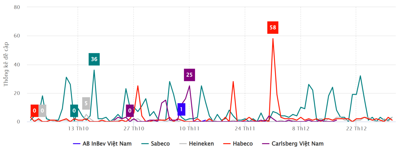 Nhìn chung, bức tranh lượt đề cập tích cực và tiêu cực cho thấy Sabeco là thương hiệu nhận được sự quan tâm lớn nhất từ cộng đồng, đi kèm cả ghi nhận tích cực và áp lực dư luận, trong khi các thương hiệu còn lại có mức độ thảo luận thấp hơn và ít biến động hơn về sắc thái cảm xúc.